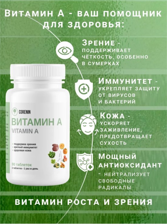 Витамин А от бренда Corenin — это важный элемент для поддержания здоровья и нормального функционирования организма. В каждой упаковке содержится 90 таблеток по 450 мг, что обеспечивает достаточное количество витамина для ежедневного потребления.