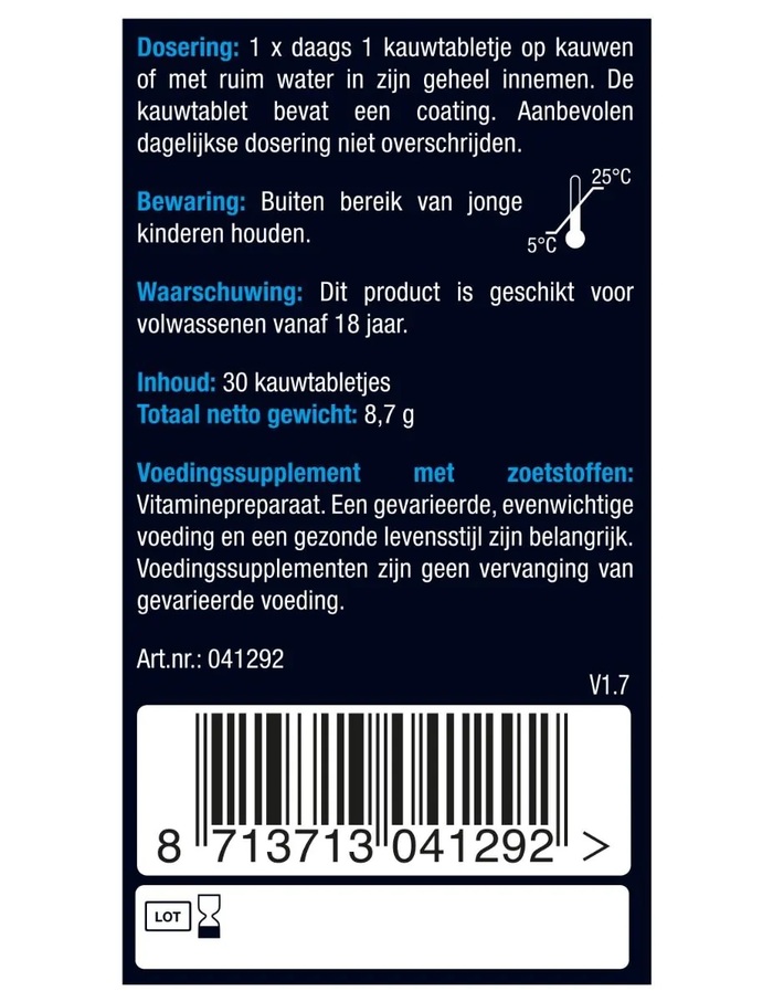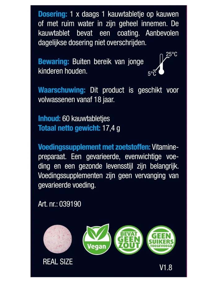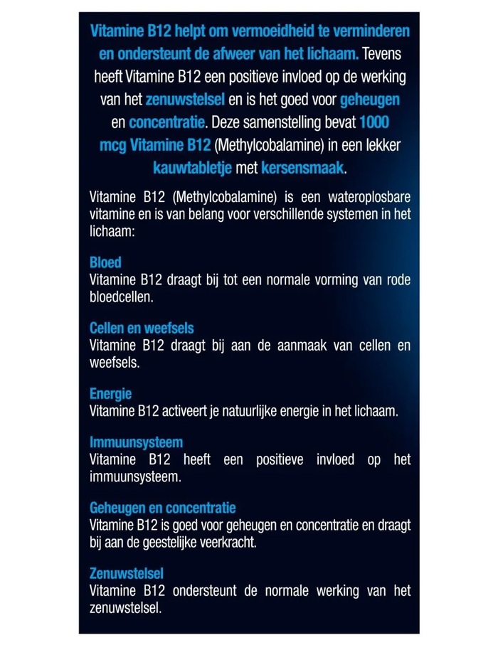 Жевательные таблетки имеют вкус вишни, что делает их особенно привлекательными для людей, которые предпочитают не глотать капсулы или таблетки. Продукт подходит для вегетарианцев и веганов, обеспечивая необходимый уровень витамина B12.