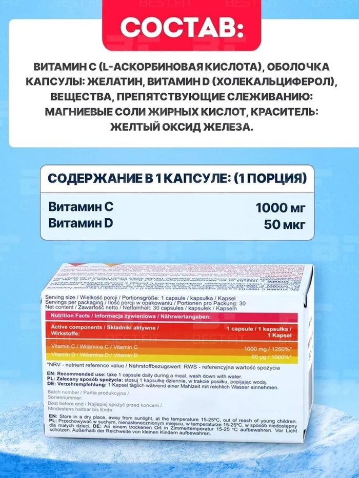 Капсулы легко проглатываются и подходят для ежедневного использования. Витамин C 1000 + D3 от Allnutrition идеально подходит для людей, ведущих активный образ жизни и нуждающихся в дополнительной поддержке витаминов.