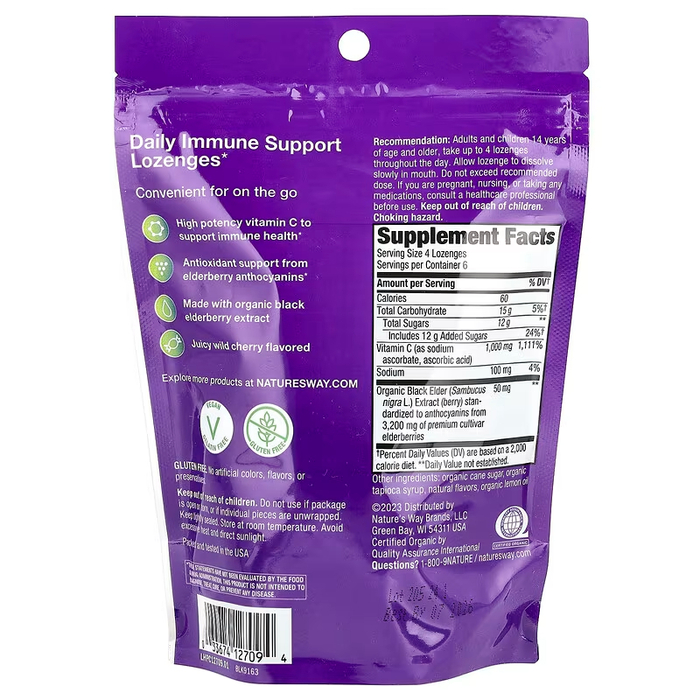 Nature's Way Витамин C Sambucus отличается высоким качеством ингредиентов и натуральным составом. Леденцы не содержат искусственных красителей и консервантов, что делает их безопасными для ежедневного употребления. Продукт подходит для вегетарианцев и не содержит глютен.