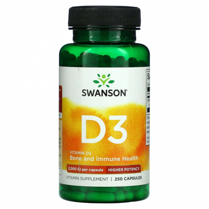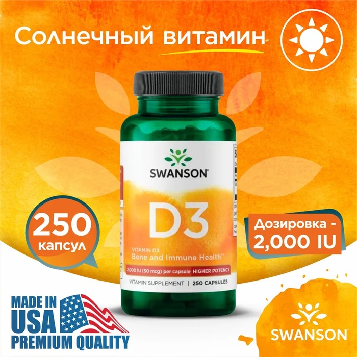 Витамин D3 (2000 IU) от бренда Swanson — это высококачественная добавка, которая поддерживает здоровье вашего организма. В каждой упаковке содержится 250 капсул, обеспечивающих необходимую дозу витамина D3 для поддержания оптимального уровня в организме.