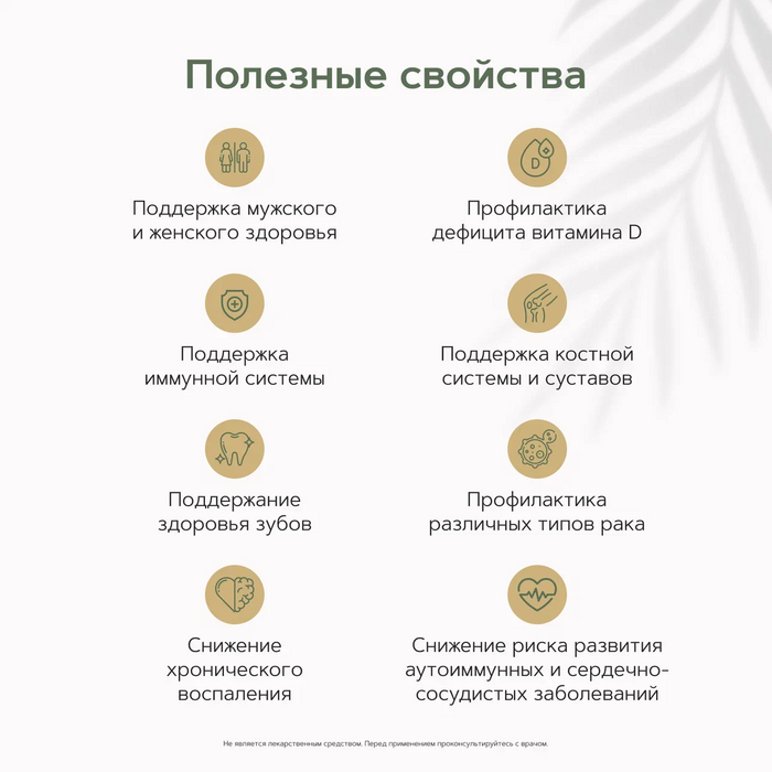 • Укрепление иммунной системы: Витамин D3 способствует активизации иммунных клеток, что помогает организму бороться с инфекциями.