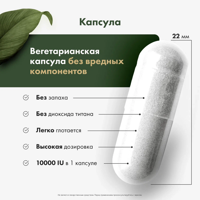 Капсулы легко проглатываются и подходят для ежедневного приема. Рекомендуется использовать в период недостатка солнечного света или при повышенных физических нагрузках.