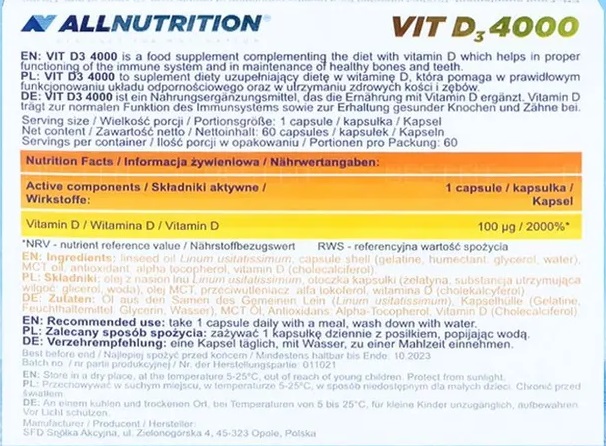 Витамин D3 Allnutrition VIT D3 4000 — это высококачественная добавка, содержащая 60 капсул, каждая из которых обеспечивает ваш организм необходимым витамином D3 для поддержания здоровья.