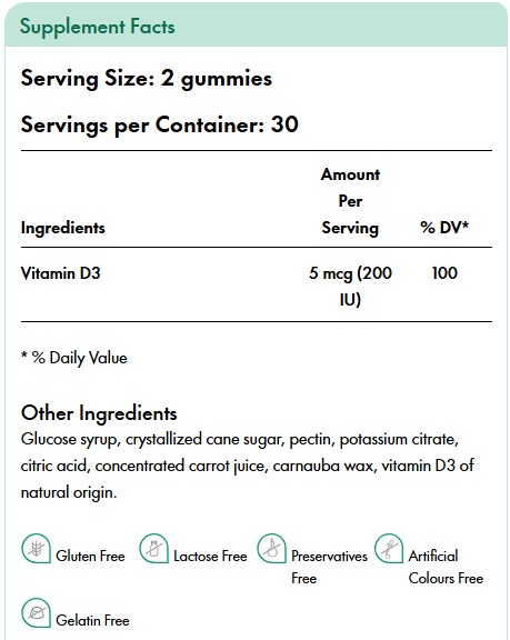 • Поддержка костей и зубов: Витамин D3 помогает укрепить кости и зубы, улучшая усвоение кальция и фосфора.