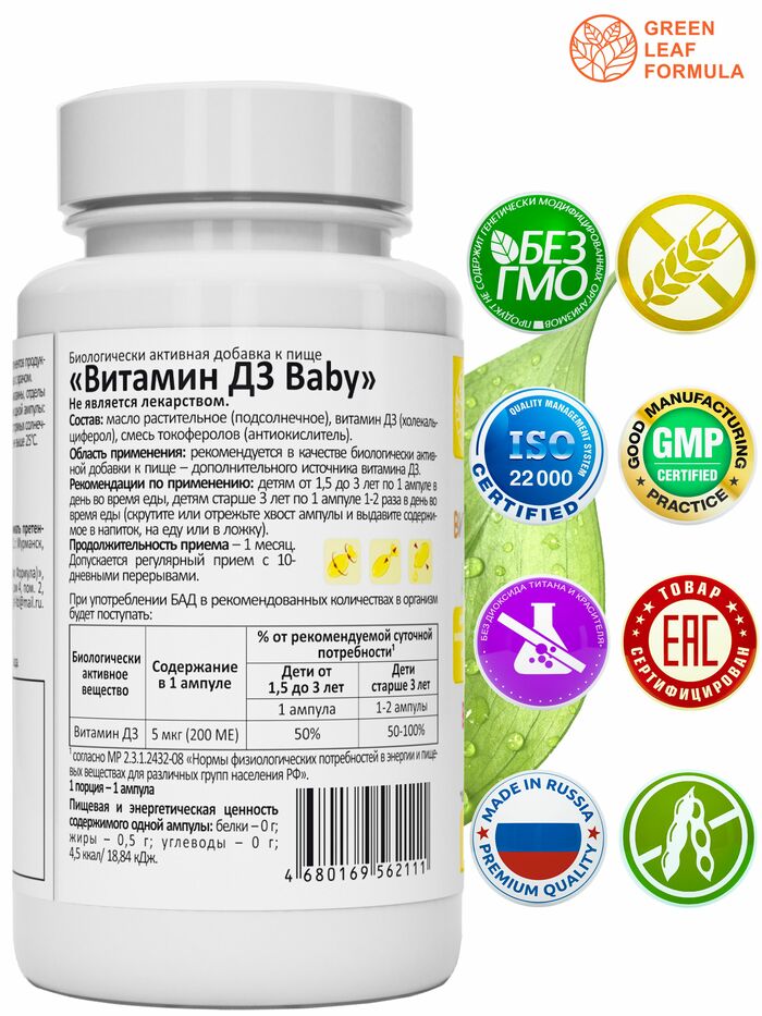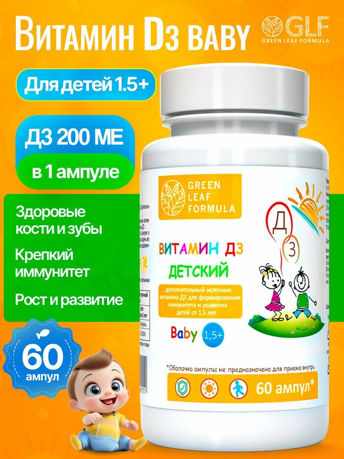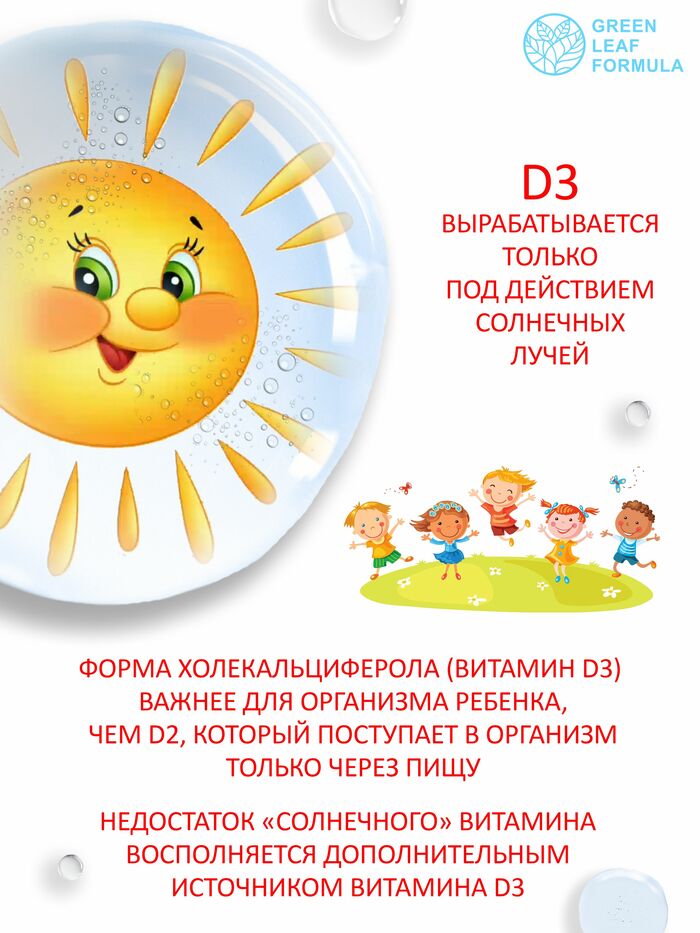 Витамин Д3 от GREEN LEAF FORMULA имеет высокую биодоступность и легко усваивается организмом. Продукт подходит для детей старше 1,5 лет и может использоваться в качестве дополнения к рациону в осенне-зимний период.