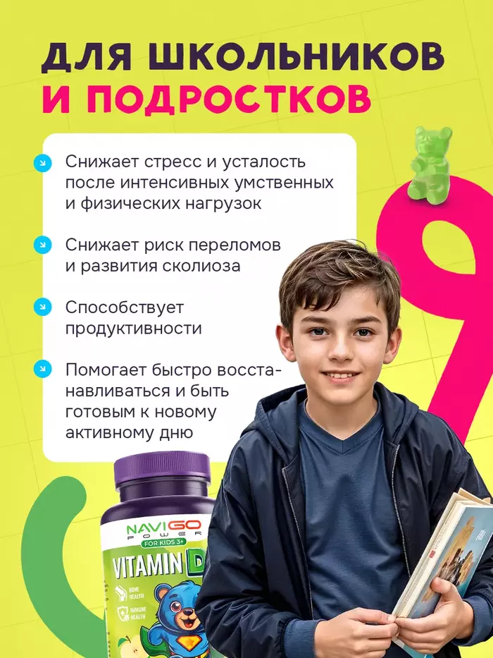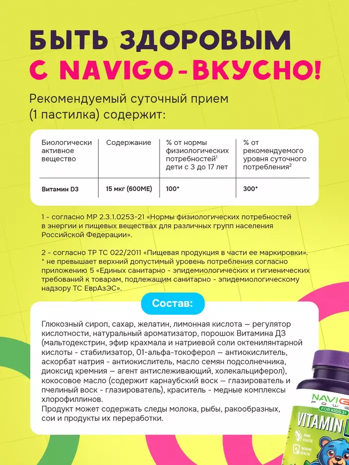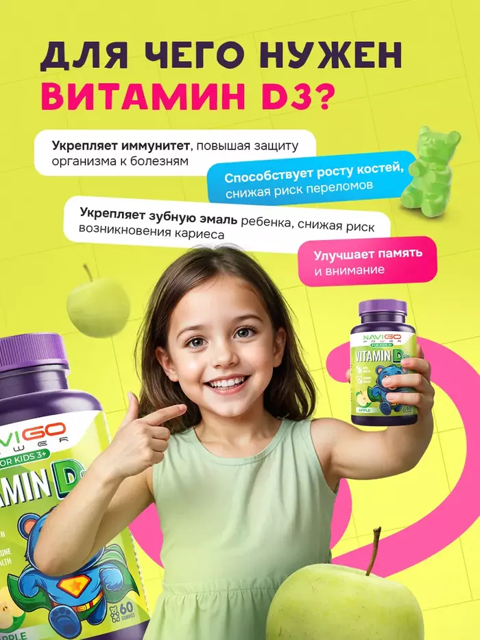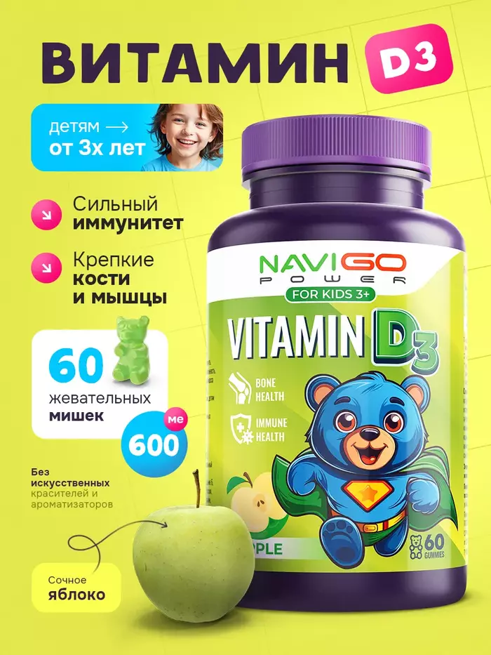Витамин Д3 для детей Яблоко — это идеальное решение для поддержания здоровья ваших детей. В каждой упаковке содержится 60 жевательных пастилок с приятным яблочным вкусом от бренда NAVIGO POWER, которые обеспечат необходимыми витаминами для роста и развития.
