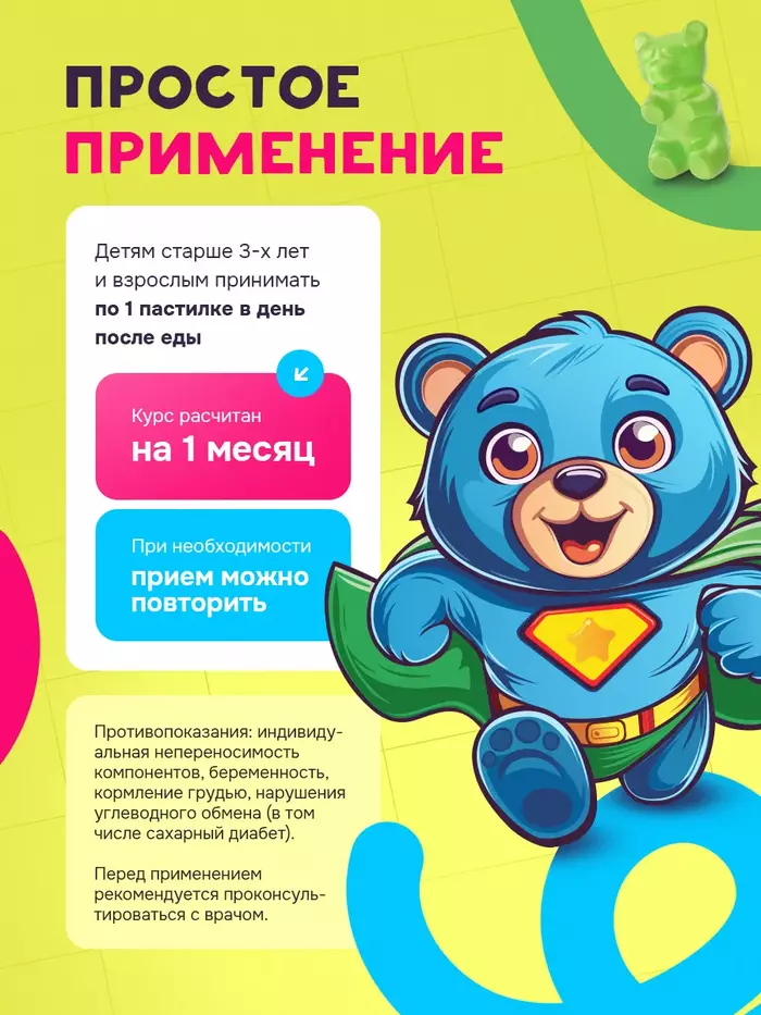 Жевательные пастилки имеют привлекательную форму и приятный яблочный вкус, что делает их особенно любимыми среди детей. Комплекс подходит для использования в периоды простудных заболеваний, при умственных и физических нагрузках, а также при несбалансированном питании.