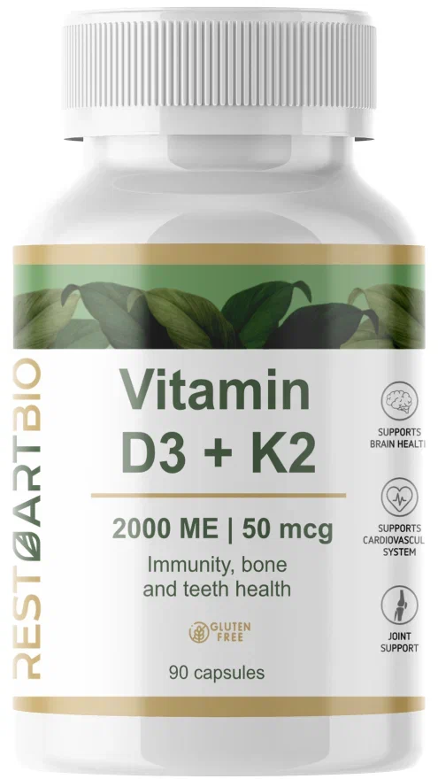 Витамин D3 + K2 (2000 МЕ) от бренда RestartBio — это высококачественная добавка, которая поддерживает здоровье костей и иммунной системы. В каждой упаковке содержится 90 капсул, обеспечивающих оптимальное усвоение витаминов.