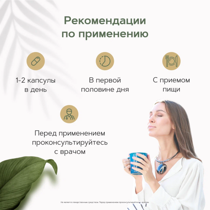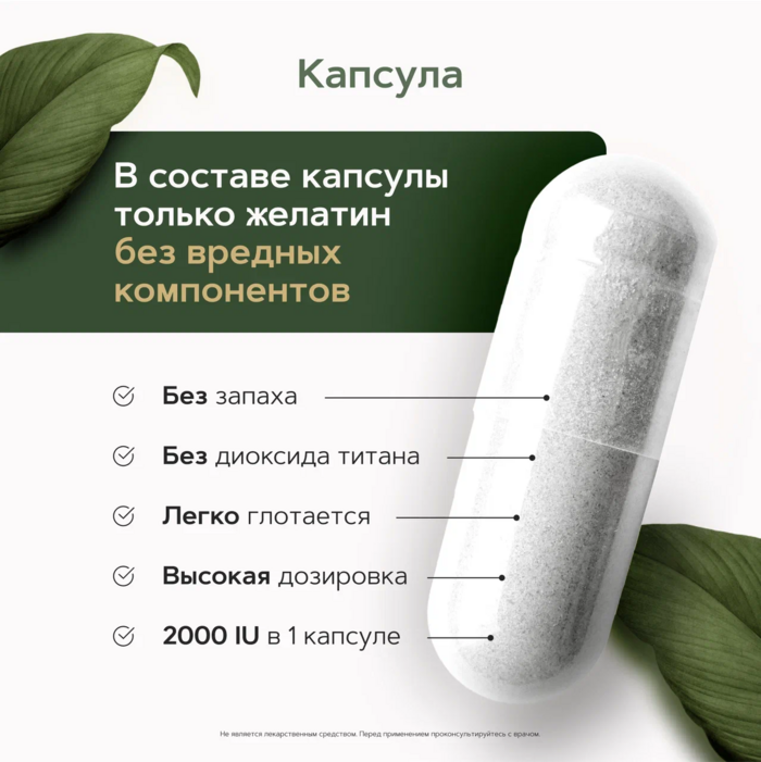 Капсулы легко проглатываются и подходят для ежедневного использования. Рекомендуется для людей, ведущих активный образ жизни, а также для тех, кто не получает достаточного количества солнечного света.