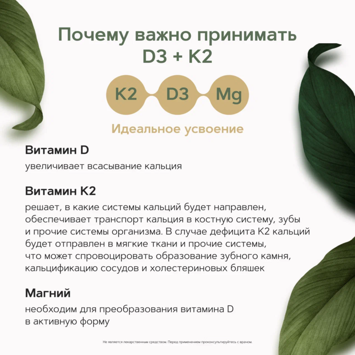 • Синергия витаминов: Комбинация D3 и K2 обеспечивает максимальную эффективность и усвоение этих витаминов.