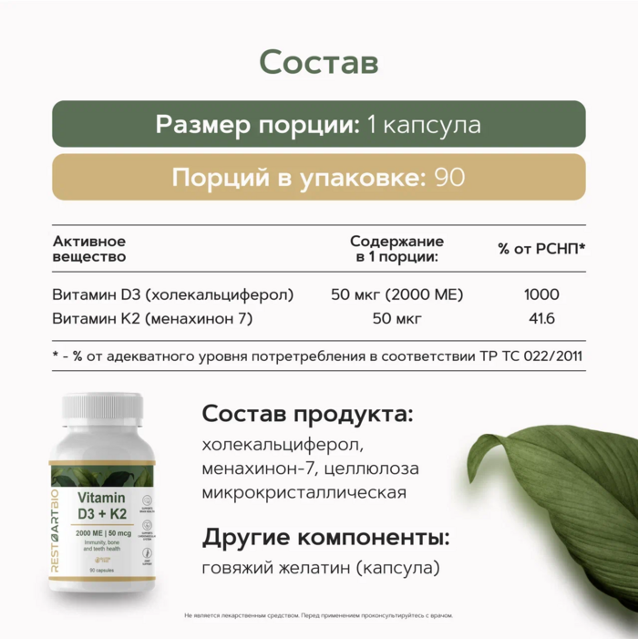 RestartBio Витамин D3 + K2 (2000 МЕ), 90 капсул