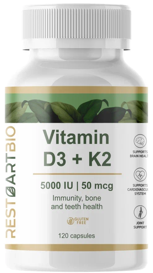 Витамин D3 + K2 (5000 ME) от бренда RestartBio — это высококачественная добавка, которая поддерживает здоровье костей и иммунной системы. В каждой упаковке содержится 120 капсул, обеспечивающих оптимальное усвоение витаминов.