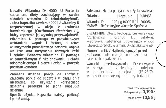 Витамин D3 Novativ 4000 МЕ Форте — это высококачественная добавка, предназначенная для поддержания нормального уровня витамина D в организме. В каждой упаковке содержится 60 капсул, что обеспечивает длительный курс приема.