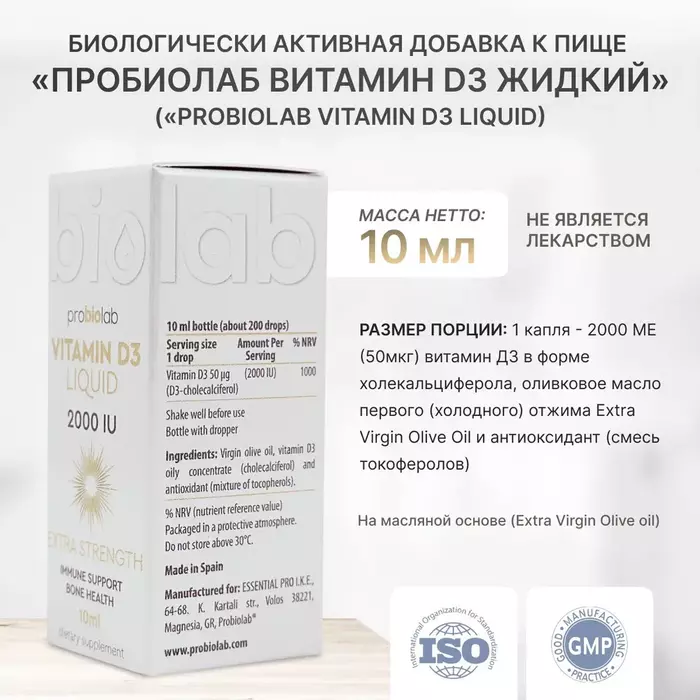 Витамин D3 (холекальциферол) в каплях эффективнее таблеток, а кроме того он изготовлен на основе Extra Virgin Olive Oil, что способствует его максимальному усвоению. Витамин D3 от Probiolab не содержит консервантов, красителей и подсластителей, что делает его еще более привлекательным для тех, кто заботится о своем здоровье.