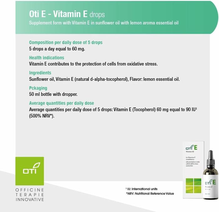 Витамин Е Oti E в каплях — это высококачественный продукт, который обеспечивает ваш организм необходимым витамином для поддержания здоровья. В каждой упаковке содержится 50 мл витамина Е, который легко усваивается и подходит для ежедневного использования.