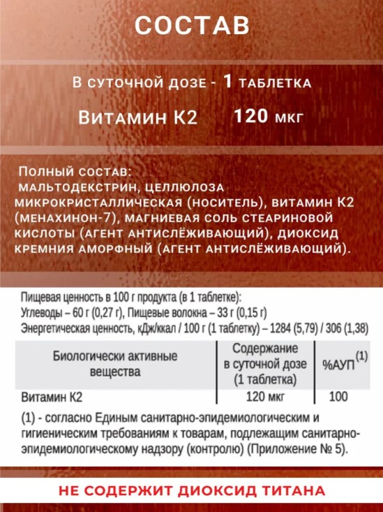 Таблетки легко проглатываются и не содержат искусственных добавок, что делает их безопасными для регулярного использования. Витамин К2 подходит для людей, следящих за своим здоровьем и желающих поддерживать оптимальный уровень витаминов в организме.
