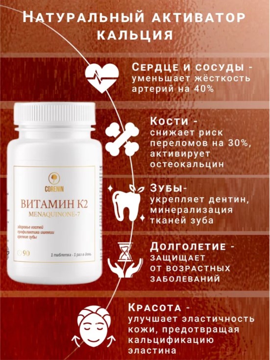 • Улучшение усвоения кальция: Витамин К2 активирует белки, которые помогают направлять кальций в кости и зубы, а не в мягкие ткани.