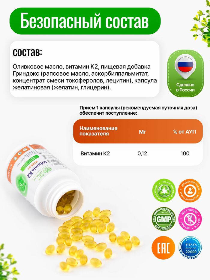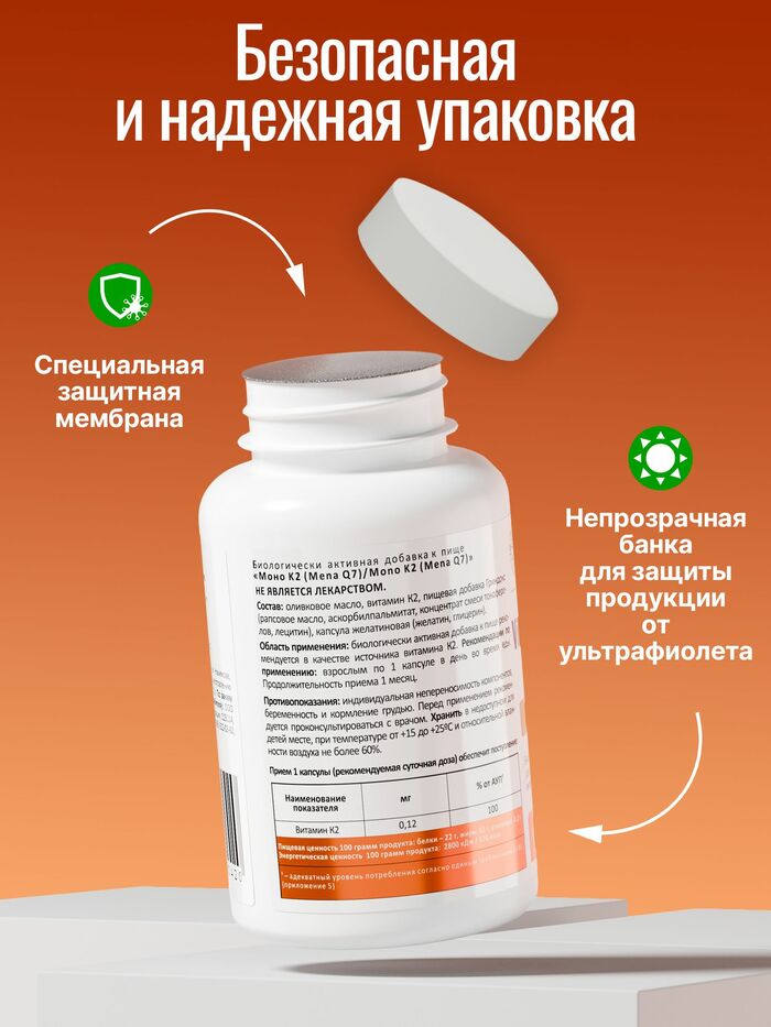 K2 Mena Q7 в активной форме менахинона-7 (МК-7) в оптимальной суточной дозировке: 100 % от РСП в 1 капсуле.Запатентованная форма витамина К2 из Норвегии с клинически доказанной эффективностью и биодоступностью для максимального усвоения. Прием витамина К2 оказывает следующее действие:Правильно распределяет усвоение кальция в организме: в первую очередь в костях и зубах, во вторую очередь в мягких тканях.Поддерживает здоровье сосудов и сердца - предотвращает кальцификацию и сохраняет эластичность артерий и сосудов, вен.Укрепляет кости и зубы - направляет кальций именно в костную ткань, активируя белок остеокальцин.Повышает иммунитет - участвует в синтезе белков, поддерживающих защитные функции организма, оказывает противовоспалительное действие. Рекомендован при приеме кальция и витамина D3 - усиливает их действие и предотвращает кальциевые отложения.Полезен:при приеме статинов, предотвращая их побочное действие,при вымывании кальция из организма, особенно в пожилом возрасте.Не содержит: диоксид титана, химический краситель, ГМО, сою, глютен.Противопоказания: индивидуальная непереносимость компонентов, беременность и кормление грудью. Перед применением рекомендуется проконсультироваться с врачом.