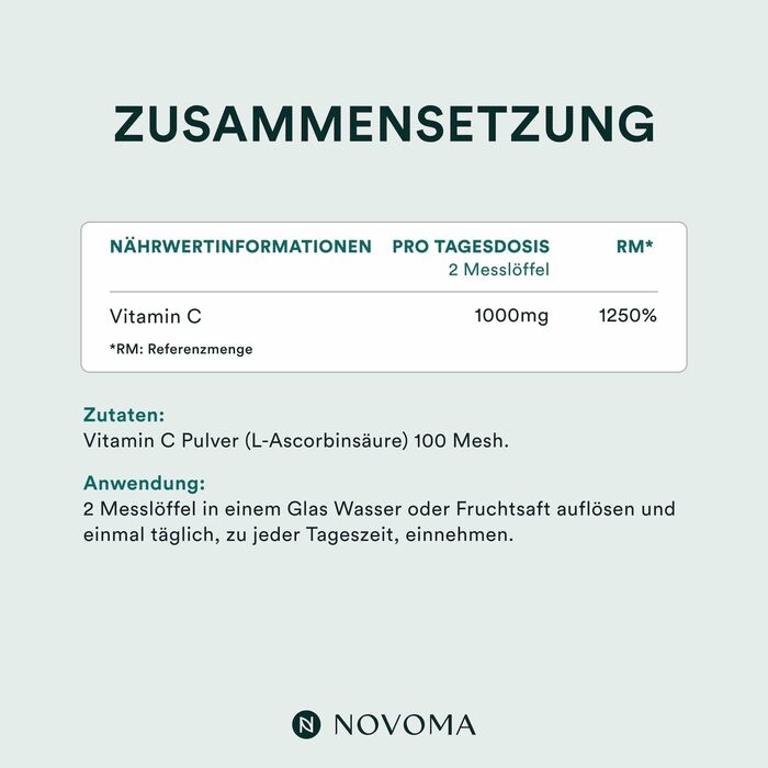 Порошок легко растворяется в воде и может быть добавлен в напитки или пищу, что делает его удобным в использовании. Витамин С Novoma Pure подходит для вегетарианцев и веганов.