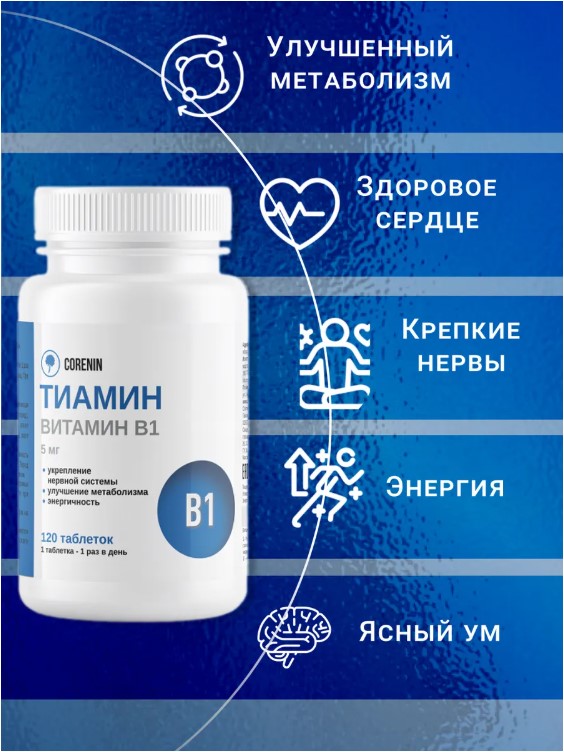 Витамин В1 (Тиамин) от бренда Corenin — это важный элемент для поддержания нормального обмена веществ и здоровья нервной системы. В каждой упаковке содержится 120 таблеток, которые помогут вам обеспечить необходимую дозу этого витамина.