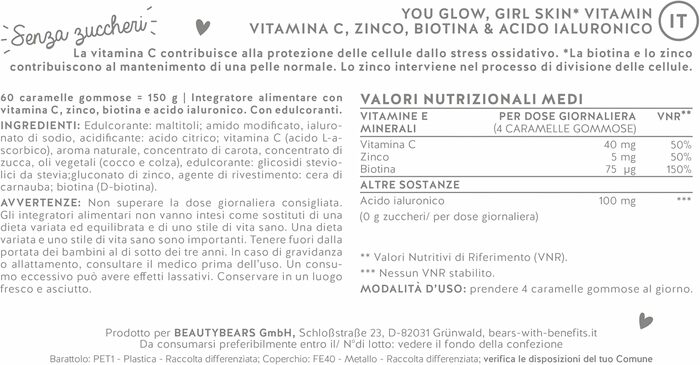 Витаминные жевательные мишки Bears With Benefits Hyaluron Skin с цинком для кожи — это отличный способ поддержать здоровье вашей кожи. В каждой упаковке содержится 30 жевательных мишек с приятным вкусом, которые обеспечивают ваш организм необходимыми витаминами и минералами для поддержания красоты и молодости.