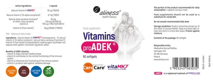 Витаминный комплекс Aliness ProADEK Витамин ADEK — это высококачественный продукт, который обеспечивает организм необходимыми витаминами A, D, E и K. В каждой упаковке содержится 60 капсул, что делает его удобным для длительного использования.
