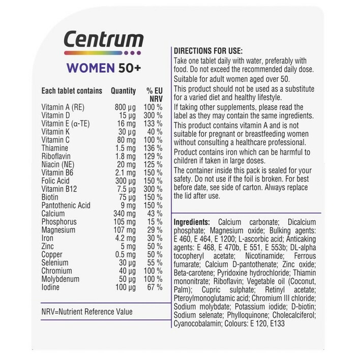 Витаминный комплекс Centrum Women 50 Plus — это идеальное решение для поддержания здоровья женщин старше 50 лет. В каждой упаковке содержится 30 таблеток, которые обеспечивают организм необходимыми витаминами и минералами.