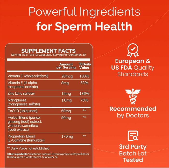 • Поддержка репродуктивной функции: Комплекс содержит ключевые витамины и минералы, способствующие улучшению качества спермы и повышению фертильности.