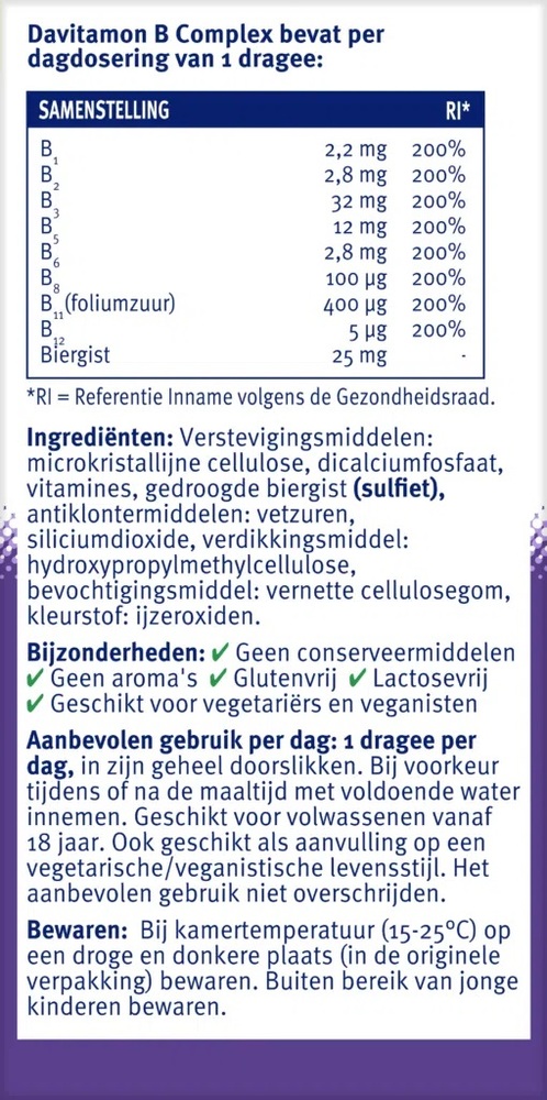 Таблетки Davitamon B-Complex Forte легко проглатываются и подходят для ежедневного использования. Комплекс идеально подходит для людей, ведущих активный образ жизни, а также для тех, кто испытывает стресс или усталость.