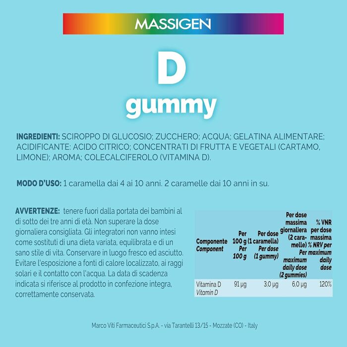 Витаминный комплекс Marco Viti Massigen D Gummy в виде мармеладных мишек — это идеальное решение для поддержания здоровья всей семьи. В каждой упаковке содержится 30 жевательных пастилок с приятным вкусом, которые обеспечат ваш организм необходимыми витаминами и минералами.