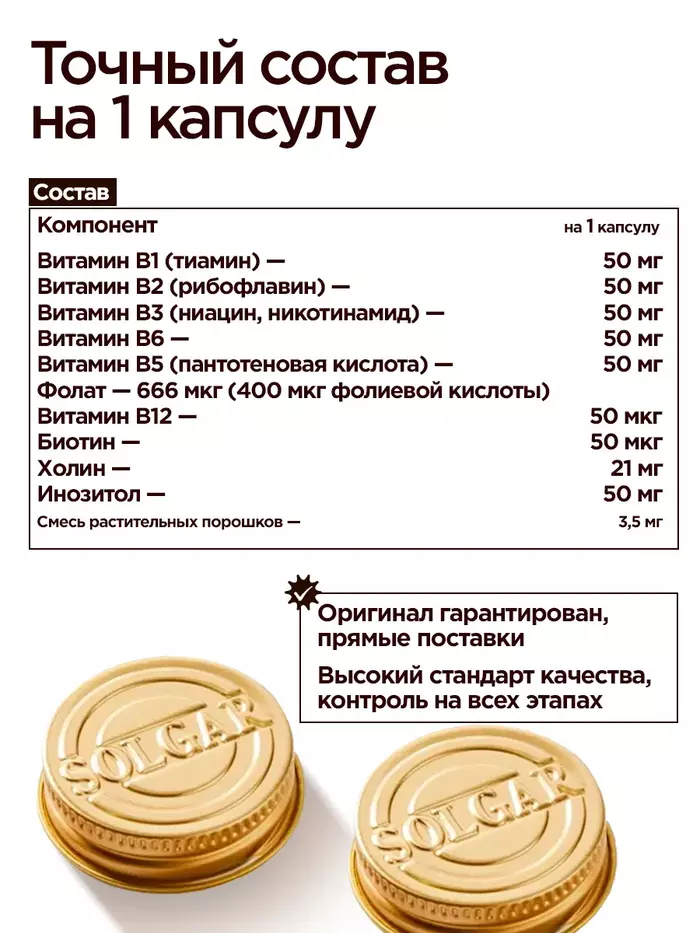 Капсулы легко проглатываются и подходят для вегетарианцев. Витаминный комплекс Solgar B-Complex 50 идеально подходит для людей с активным образом жизни и тех, кто испытывает стресс или физическую нагрузку.