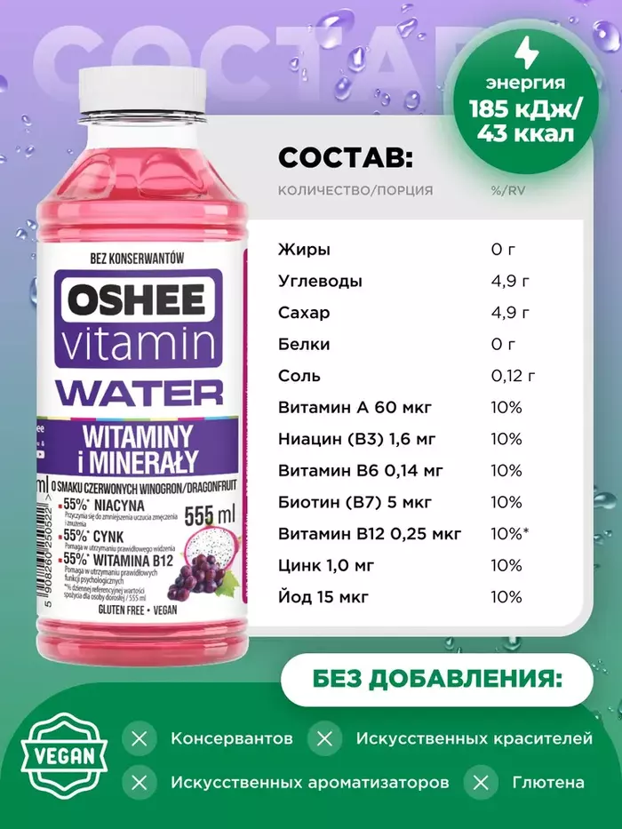 Oshee Vitamin Water представлен в удобной бутылке, что делает его идеальным для активного образа жизни. Напиток подходит для всех возрастов и может быть использован в качестве освежающего дополнения к вашему рациону.