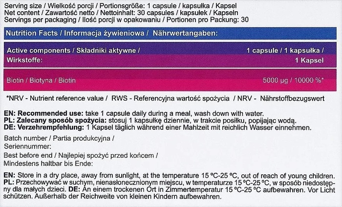 Витамины Allnutrition Biotin 5000мкг — это высококачественная добавка, предназначенная для поддержания здоровья волос, кожи и ногтей. В каждой упаковке содержится 30 капсул, каждая из которых обеспечивает организм необходимым количеством биотина.
