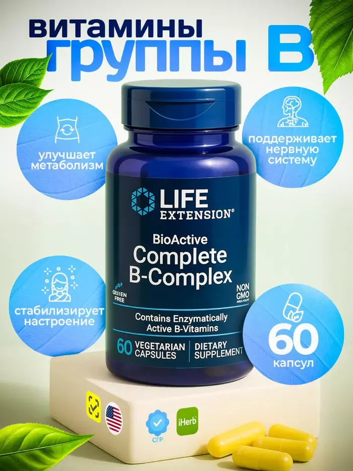 Полный биоактивный комплекс витаминов группы B, который поддерживает производство энергии, функцию органов, когнитивную функцию и другие важные метаболические процессы. BioActive Complete B-Complex содержит биологически активные формы витамина B6, B12, ниацина, биотина, фолиевой кислоты 5-MTHF и других, что делает его отличным способом получения витаминов B. Полный биоактивный комплекс витаминов группы B содержит биологически активные формы каждого питательного вещества, оптимизируя усвоение и давая организму все необходимое для развития. Высокий уровень витамина B может поддерживать в организме производство энергии, функционирование всех органов, когнитивную функцию и необходимые метаболические процессы, поддерживает энергетические процессы в организме, помогает восполнить потенциальный дефицит витамина B. Витамин B5 или пантотеновая кислота поддерживает синтез гемоглобина, работу гормонов и нейромедиаторов, а также окисление углеводов и жирных кислот. Витамин B6 влияет на метаболизм аминокислот и жиров, работу нейротрансмиттеров и синтез гемоглобина.Применение: Принимать по 2 капсулы в день во время еды.Противпопоказания: При беременности проконсультироваться с врачом, могут быть противопоказания.