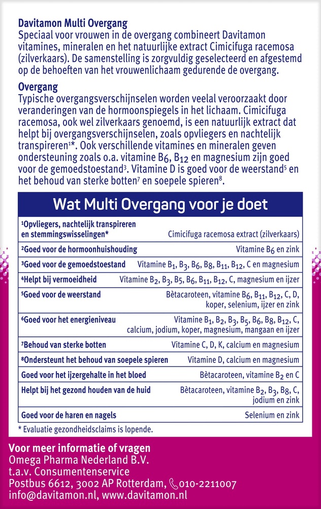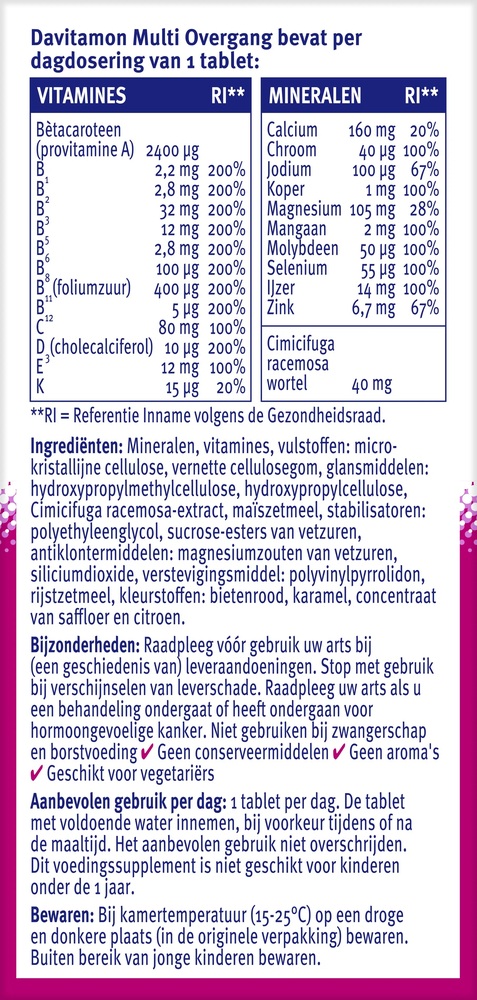 Витамины Davitamon Complete Woman Menopause — это специально разработанный мультивитаминный комплекс для женщин в период менопаузы. В каждой упаковке содержится 30 жевательных пастилок с приятным вкусом, которые обеспечивают организм необходимыми витаминами и минералами.