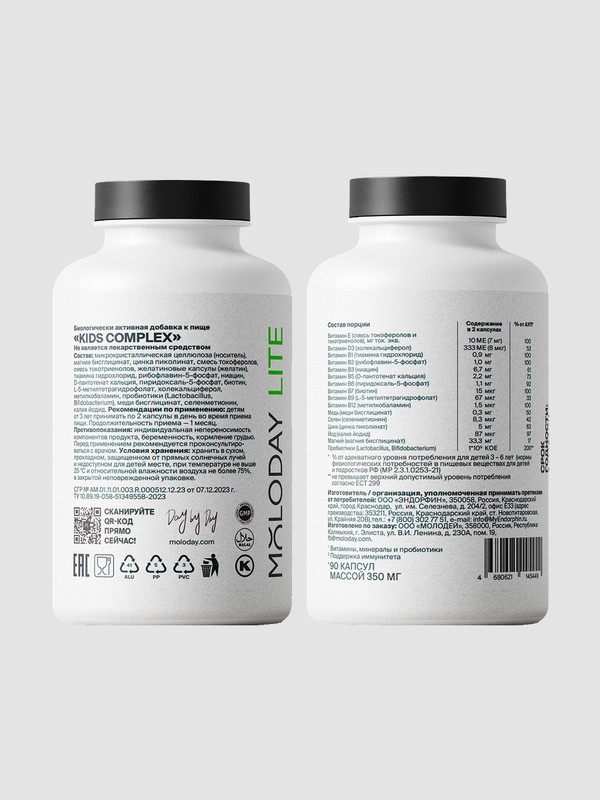 MOLODAY Витамины для детей Kids complex с пробиотиками для кишечника, 90 капсул