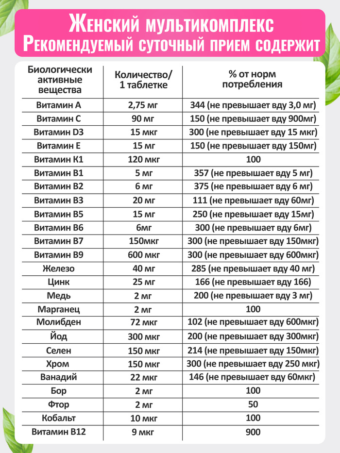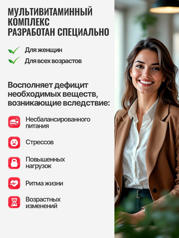 Таблетки имеют удобную форму и легко проглатываются, что делает их особенно привлекательными для женщин. Комплекс подходит для использования в периоды простудных заболеваний, при умственных и физических нагрузках, а также при несбалансированном питании.