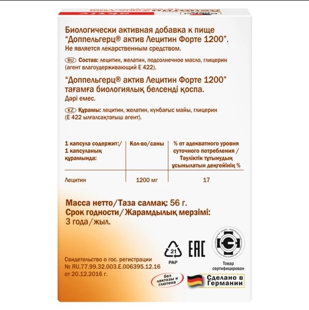Витамины Doppelherz Aktiv Лецитин Форте — это эффективный комплекс для поддержания здоровья и улучшения работы мозга. В каждой упаковке содержится 30 капсул, которые обеспечивают организм необходимым лецитином.