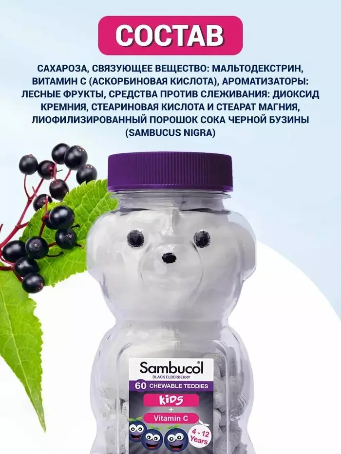 Витамины Sambucol Original Black Elderberry для детей — это отличный способ поддержать здоровье вашего ребенка. В каждой упаковке содержится 60 жевательных таблеток с приятным вкусом черной бузины, которые обеспечивают необходимую поддержку иммунной системы.