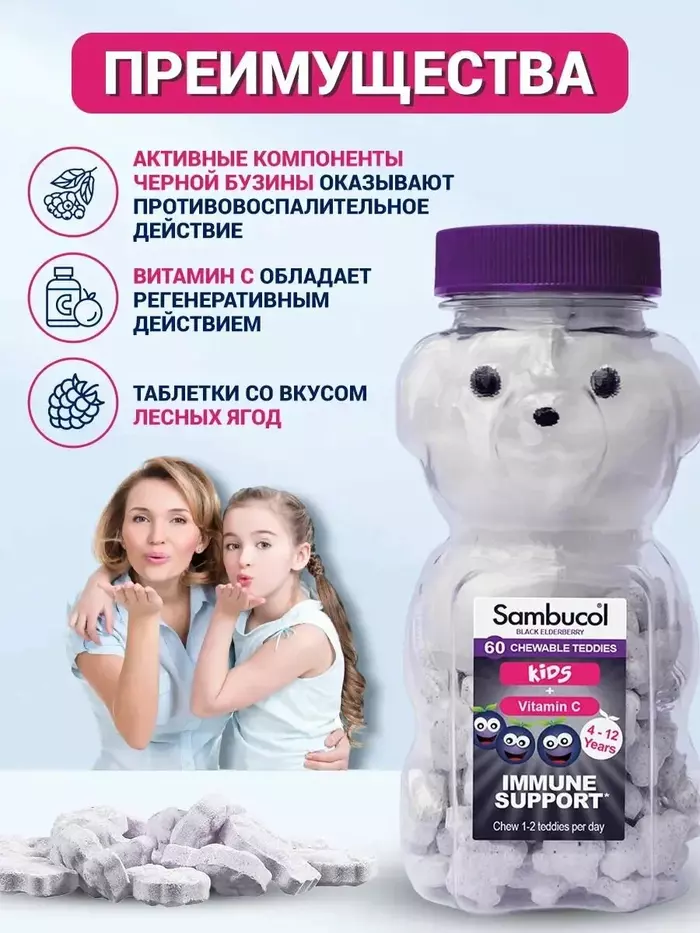 Жевательные таблетки Sambucol Original Black Elderberry имеют привлекательный вид и вкус, что делает их идеальными для ежедневного приема детьми. Они подходят для использования в периоды повышенной заболеваемости и активных нагрузок.