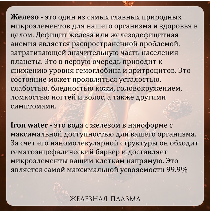 • Высокая биодоступность: Iron Water обеспечивает максимальное усвоение железа организмом благодаря плазменной наноформе.