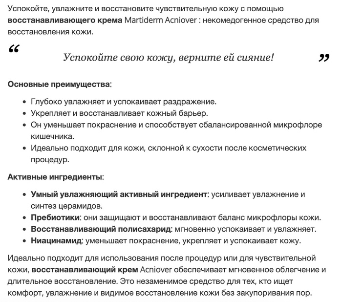 Крем Martiderm Acniover имеет легкую текстуру, быстро впитывается и не оставляет жирного блеска. Он подходит для ежедневного использования и может быть применен как основа под макияж.