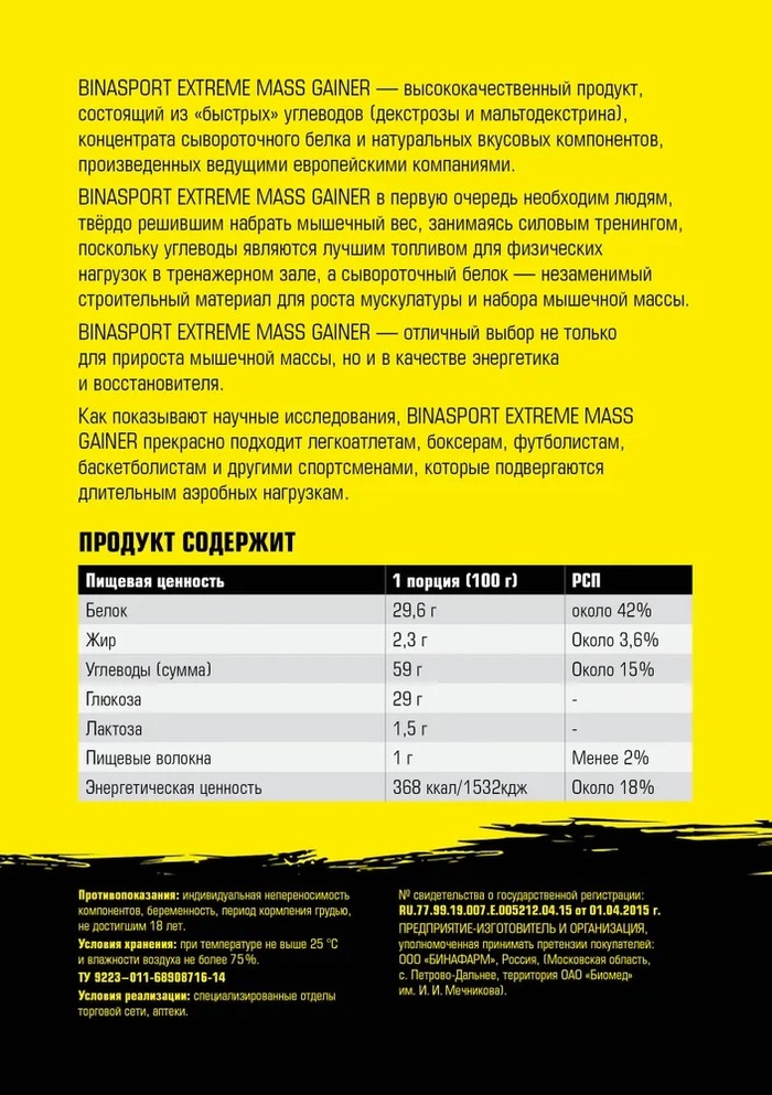 • Высокое содержание белка: Гейнер содержит оптимальное количество белка, что способствует росту и восстановлению мышечной ткани.