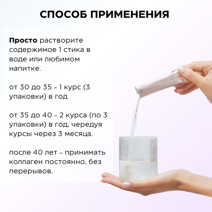 Принимать коллаген Beauty Collagen α легко. Просто растворите 1 стик в 100 мл любого напитка! Вы также можете смешать его с супом или добавить в еду. При регулярном приеме коллагена и для поддержания тонуса рекомендуется употреблять по 1 стику в день в течение 28 дней. Если ранее не употребляли коллаген или после перерыва по 1 стику 2 раза в день в течение 28 дней, чтобы запустить процессы омоложения организма. Японские фармацевты рекомендуют принимать комплекс в зависимости от возраста: от 30 до 35 - 1 курс (3 упаковки) в год, от 35 до 40 - 2 курса (по 3 упаковки) в год, чередуя курсы через 3 месяца, после 40 лет - принимать коллаген постоянно, без перерывов.