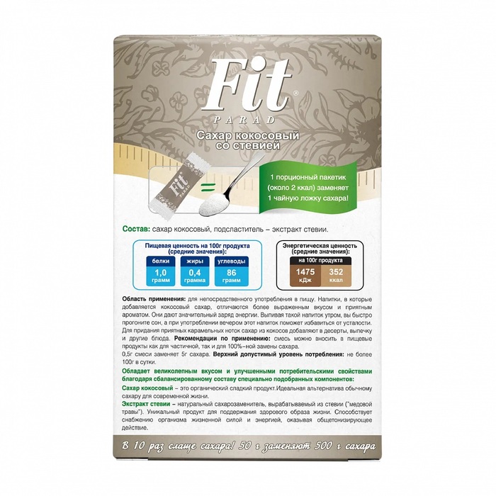 - Низкая калорийность: Благодаря сочетанию кокосового сахара и стевии, продукт обладает низкой калорийностью, что делает его идеальным для тех, кто следит за своим весом.