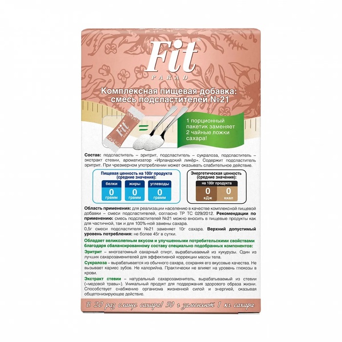 Fit Parad Заменитель сахара №21 со вкусом ирландского ликера — это удобный и вкусный способ заменить сахар в рационе, не прибегая к калориям. Продукт имеет уникальный вкус ирландского ликера, который добавляет особый аромат в напитки и десерты, оставаясь при этом низкокалорийным.