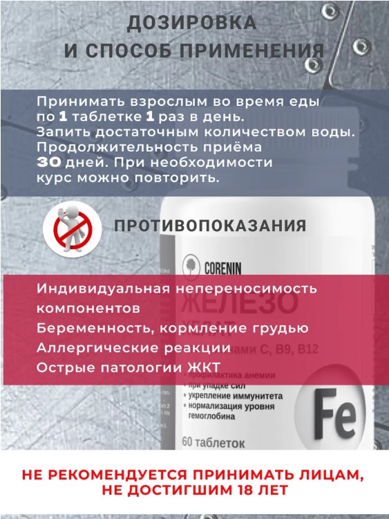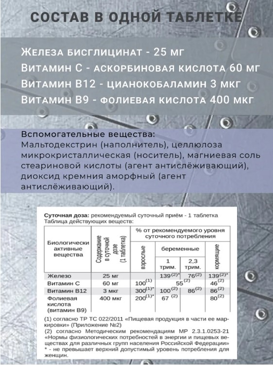Таблетки легко проглатываются и не содержат искусственных добавок, что делает их безопасными для регулярного использования. Рекомендуется принимать добавку в периоды повышенной физической активности или при недостаточном поступлении железа с пищей.