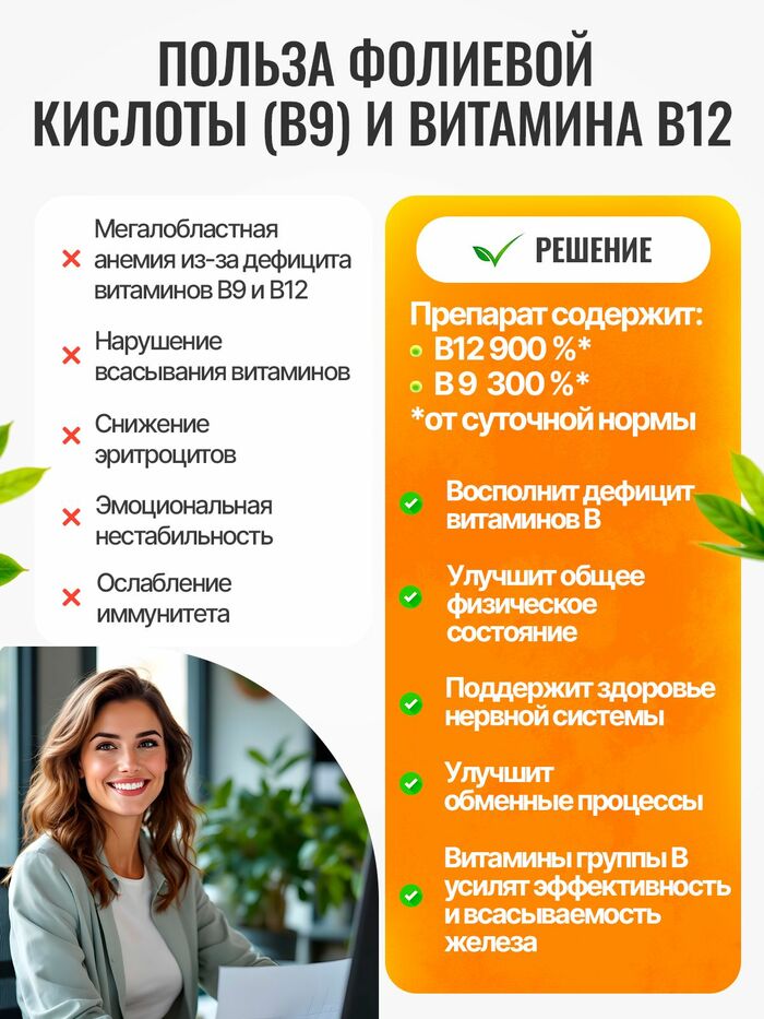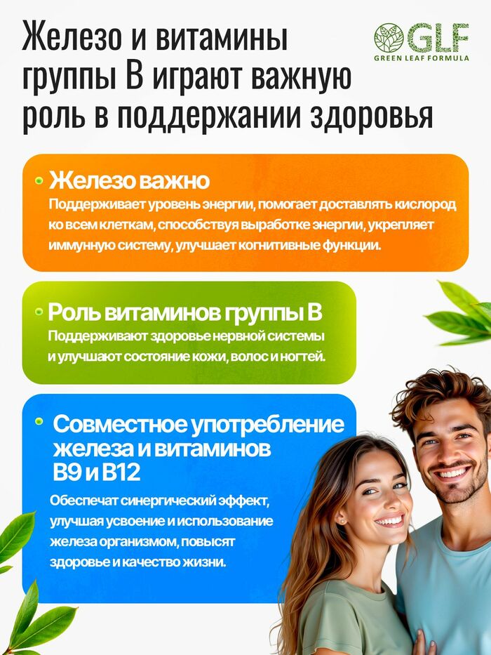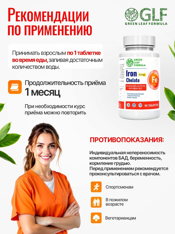 Железо хелат + Витамин В12 + Фолиевая кислота от бренда GREEN LEAF FORMULA — это высококачественный комплекс, который поддерживает здоровье и жизненную силу организма. В каждой упаковке содержится 90 таблеток, обеспечивающих необходимое количество железа, витамина В12 и фолиевой кислоты.
