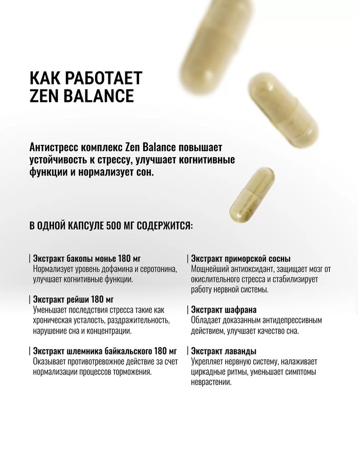Zen Balance спокойствие и ясность. Восстанавливает баланс нервной системы, улучшает память и концентрацию, не вызывая седативного эффекта. Вы обретаете внутреннее спокойствие, ясность мыслей и контроль над своими реакциями, сохраняя энергию для активной жизни.